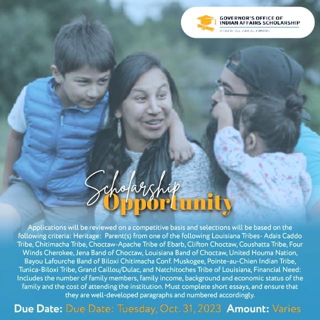With assistance from the Louisiana Indian Educational Association, the Office of Indian Affairs annually provides awards to Native American students from Louisiana tribes to attend a college or higher education institution of their choice. The awards are funded through proceeds received from the renewal and sale of special prestige license plates for motor vehicles representing Native American culture in accordance with RS 47:463:78. Recipients are selected based on academic and financial need.